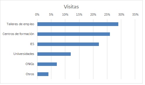 Las entidades que más visitas realizaron al CRE de Alzheimer fueron programas de formación y talleres de empleo dependientes de entidades públicas, representando un 29% del total de visitas informativas. Le siguieron las visitas de centros de formación (26%) e institutos de educación secundaria (22%). El resto corresponde a grupos procedentes de estudios universitarios y ONGs, entre otros.